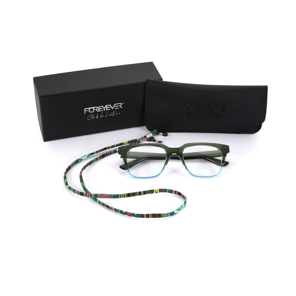 Elegante confezione regalo nera con logo Foreyever Club de Lecture in silver foil, astuccio in eco-pelle con logo inciso, cordicella colorata per appendere comodamente gli occhiali intorno al collo quando non indossati.